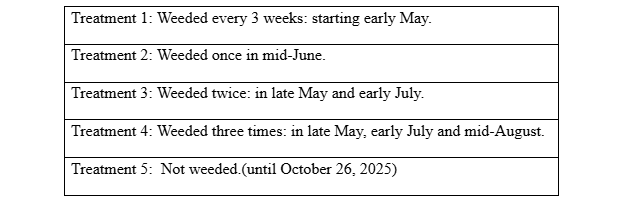 Once the MAM weeds were counted and removed from the plots, any other vegetation was allowed to remain. The control treatment mandated that hand weeding be performed every three weeks. This treatment started on May 6th and continued for 8 more 3-week intervals until October 26, 2025. At this time, the ‘untreated’ control plots were also harvested (for the first time). The results of the trial are presented in the table below: